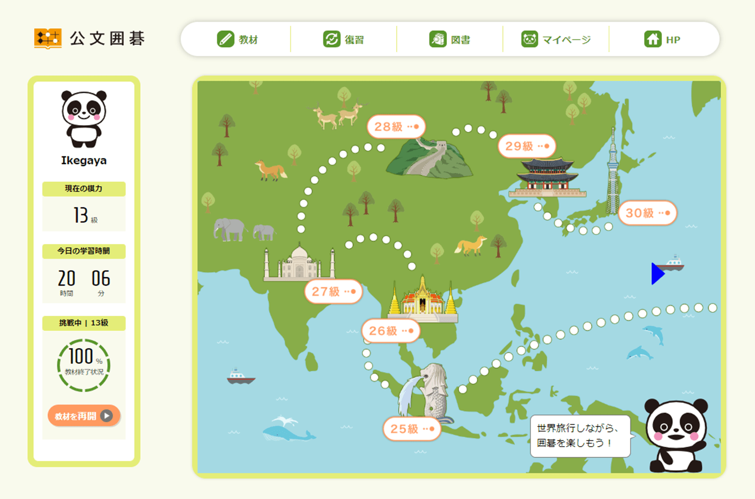 ◆「公文囲碁」の各級を修了すると、パンダが世界を横断し、その国のキャラクターがもらえます!