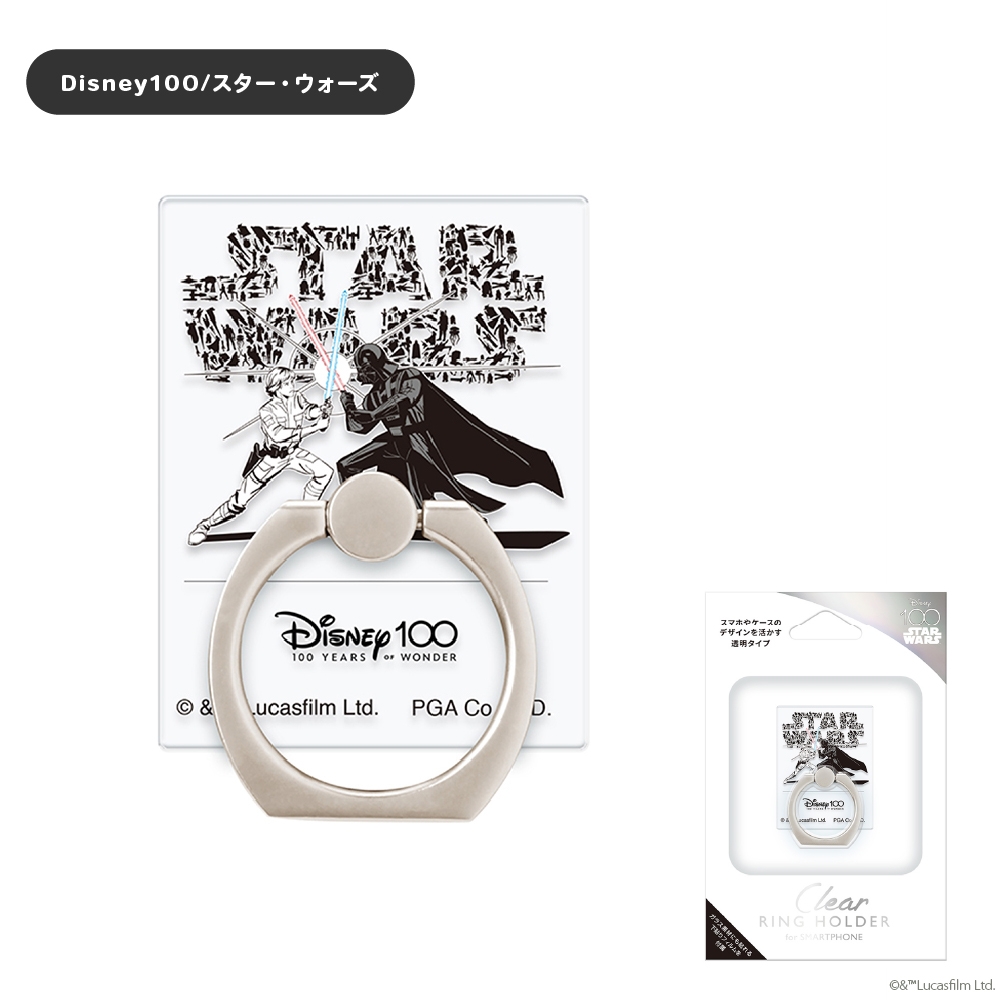 ディズニー100にインスパイアされたデザインのスマートフォン用 クリアリングホルダーです。スマートフォン本体やケースの背面に貼り付け、指を通すことで、端末の持ちやすさがアップし、落下防止の役割も果たしてくれます。360度回転するリングは動画視聴などに便利なスタンドとして使用も可能です。ガラス素材にも貼れる下貼りフィルムが付属されています。