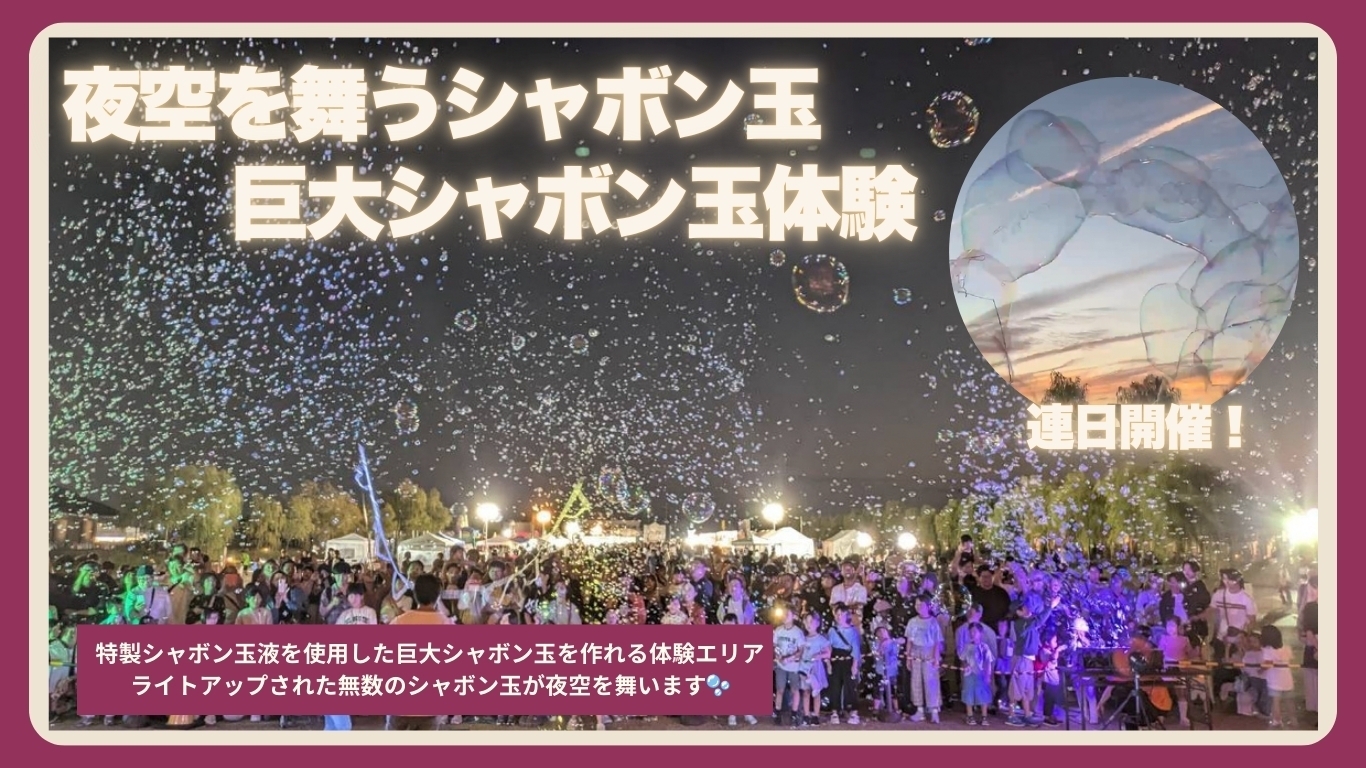日が落ちるとナイトバブルショーも共演し、音と光の幻想的な空間を演出します。