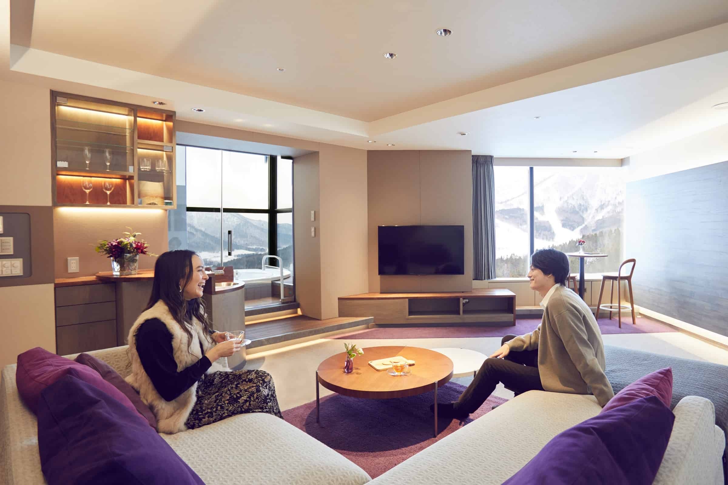ホテルの28階に位置し、大きな窓から山々の広大な景色を味わえる「デザインスイートツイン」。大自然を見渡せる展望ジェットバスやデザイン性と機能性に富んだリビングスペースを備えた、ゆったりと寛げる100平米の客室です。ほっと温まるウェルカムドリンクのルームサービスで、移動の疲れをリフレッシュできます。