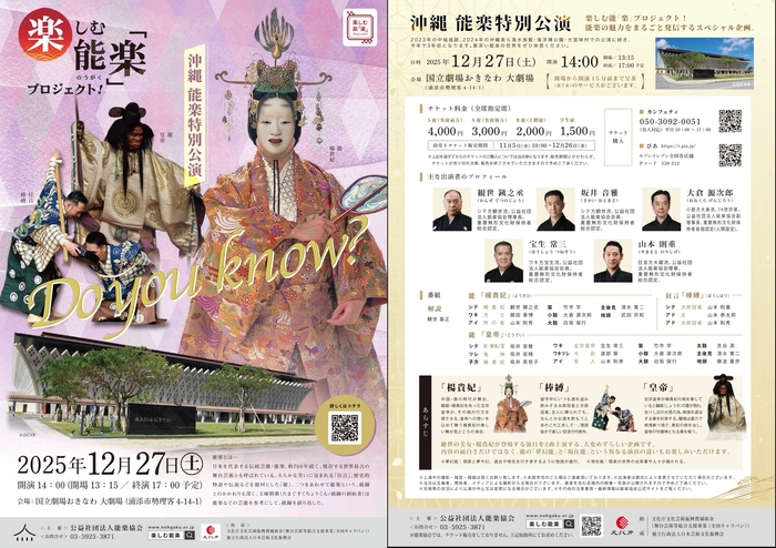 公益社団法人能楽協会主催、『楽しむ能「楽」プロジェクト!沖縄 能楽特別公演』が2025年12月27日 (土)に国立劇場おきなわ 大劇場(沖縄県浦添市勢理客4丁目14-1)にて上演されます。 チケットはカンフェティ(運営:ロングランプランニング株式会社、東京都新宿区、代表取締役:榑松 大剛)にて発売中です。