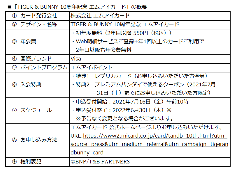 株式会社三越伊勢丹ホールディングス(本社:東京都新宿区、取締役 代表執行役社長CEO:細谷 敏幸)の子会社である、株式会社 エムアイカード(本社:東京都中央区、代表取締役社長執行役員:梅田 貴生)は、TVアニメ放映10周年を記念して「TIGER & BUNNY 10周年記念 エムアイカード」を期間限定で発行いたします。2021年7月16日(金)から2022年6月30日(木)まで申込受付いたします。