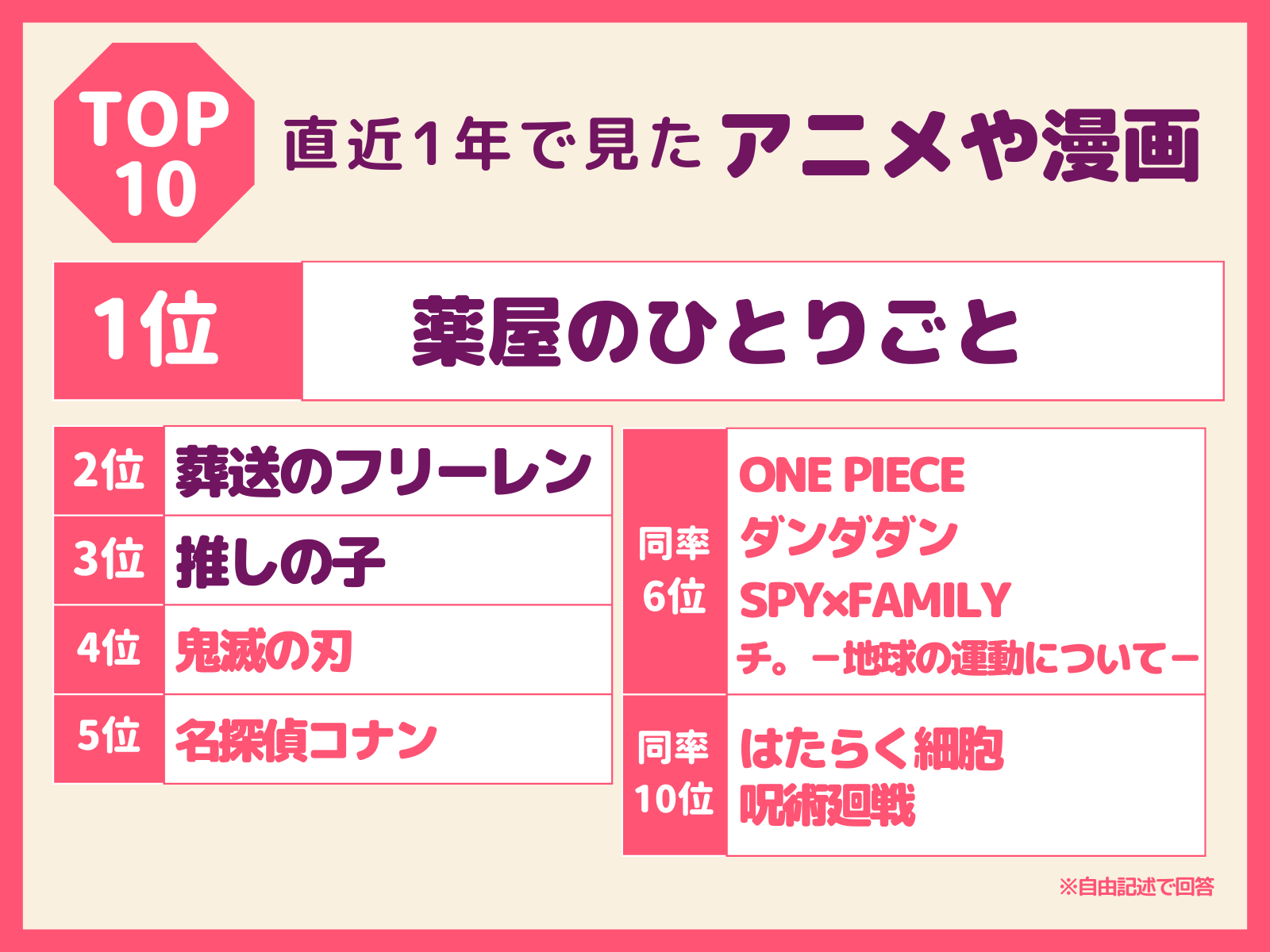 今回1位、2位にはすでに放映が終了しているアニメ、「薬屋のひとりごと」「葬送のフリーレン」がランクインしている。これらは放送終了後も、原作漫画や小説などを通して人気が継続している様子。また、3位にはドラマ配信がスタートし、映画化も決まっている「推しの子」が返り咲いている。6位以降では、今期新番組でスタートしている話題作の「ダンダダン」、「チ。-地球の運動について-」が挙がってきている。映画化が決まり、メディア露出が増えている「はたらく細胞」もランクインしている。