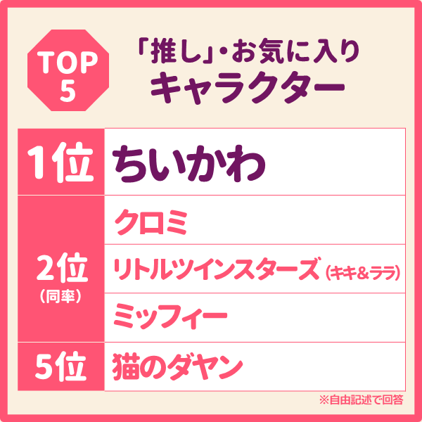 ちいかわが引き続き1位。2位と3位には3世代にアピール出来ているサンリオのクロミ、リトルツインスターズ(キキ&ララ)がランクイン。