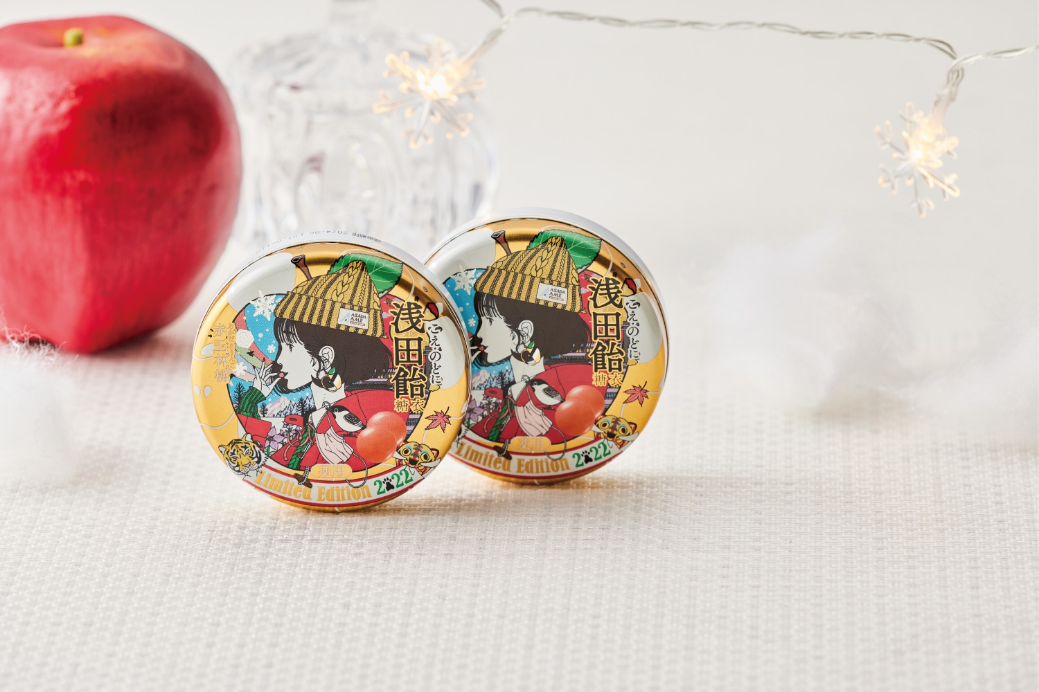 浅田飴さま、各販売店さま、愛用して下さっている皆さまのおかげで、お取り扱いも増え、販売期間も1年以上続くことになり、この度2022年度限定缶を出させて頂くことになりました。絵は通常の赤玉林檎味の冬服仕様、林檎の蜜と虎(寅年)の毛色をイメージした金色に輝く缶になっておりますので、見かけた際はぜひお手に取ってキラっとお楽しみください。そしてよりいっそう乾燥してくる季節にのどをお労りください。