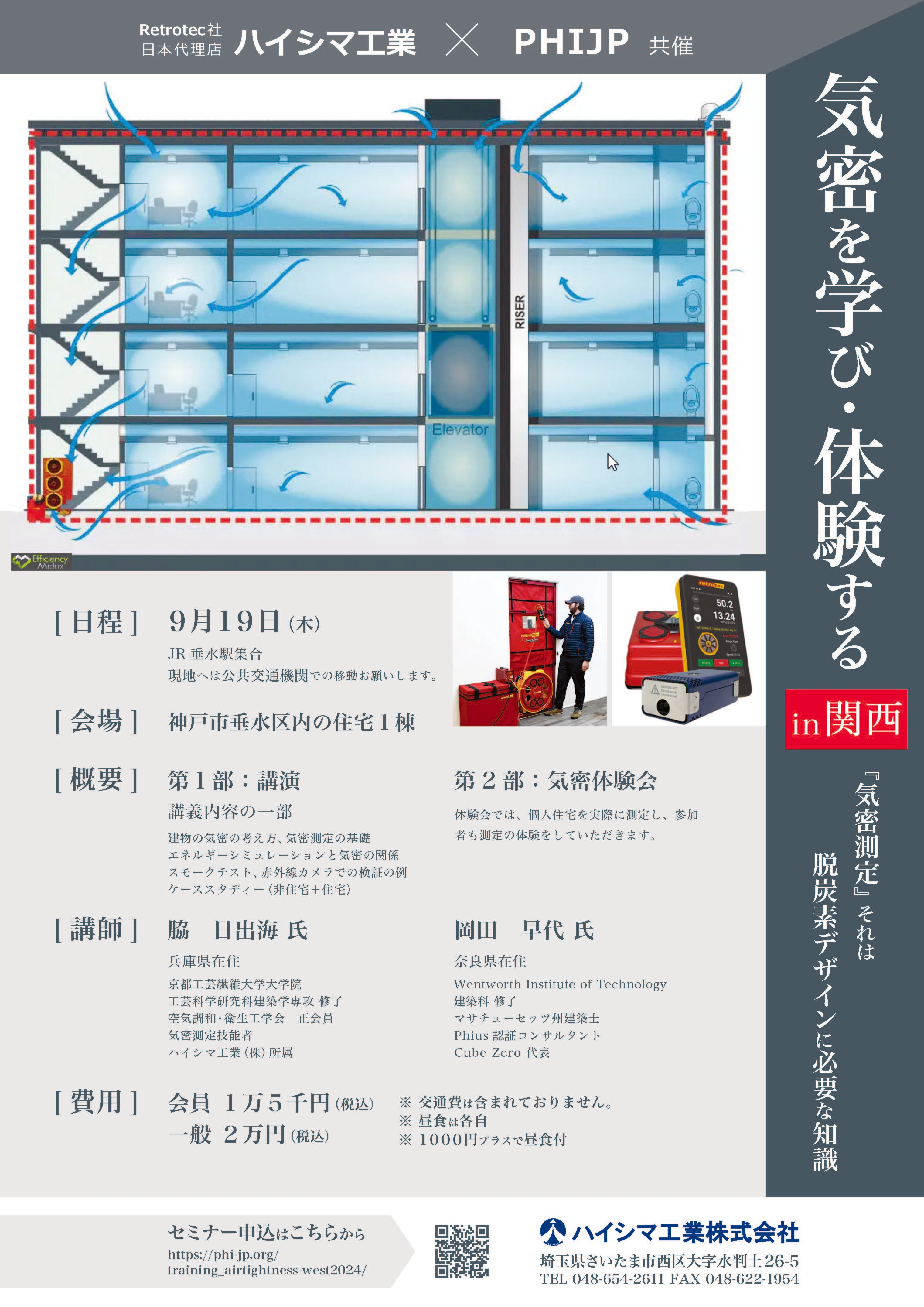 ハイシマ工業株式会社(所在地:埼玉県さいたま市西区)と特定非営利活動法人PHIJP(所在地:東京都港区)は、大規模の気密測定の考え方・体験などを通じて気密測定についてより理解していただき、建物の断熱性能の向上を目指す目的として「気密を学び・体験する in関西」を兵庫県神戸市にて2024年9月19日(木)に開催します。