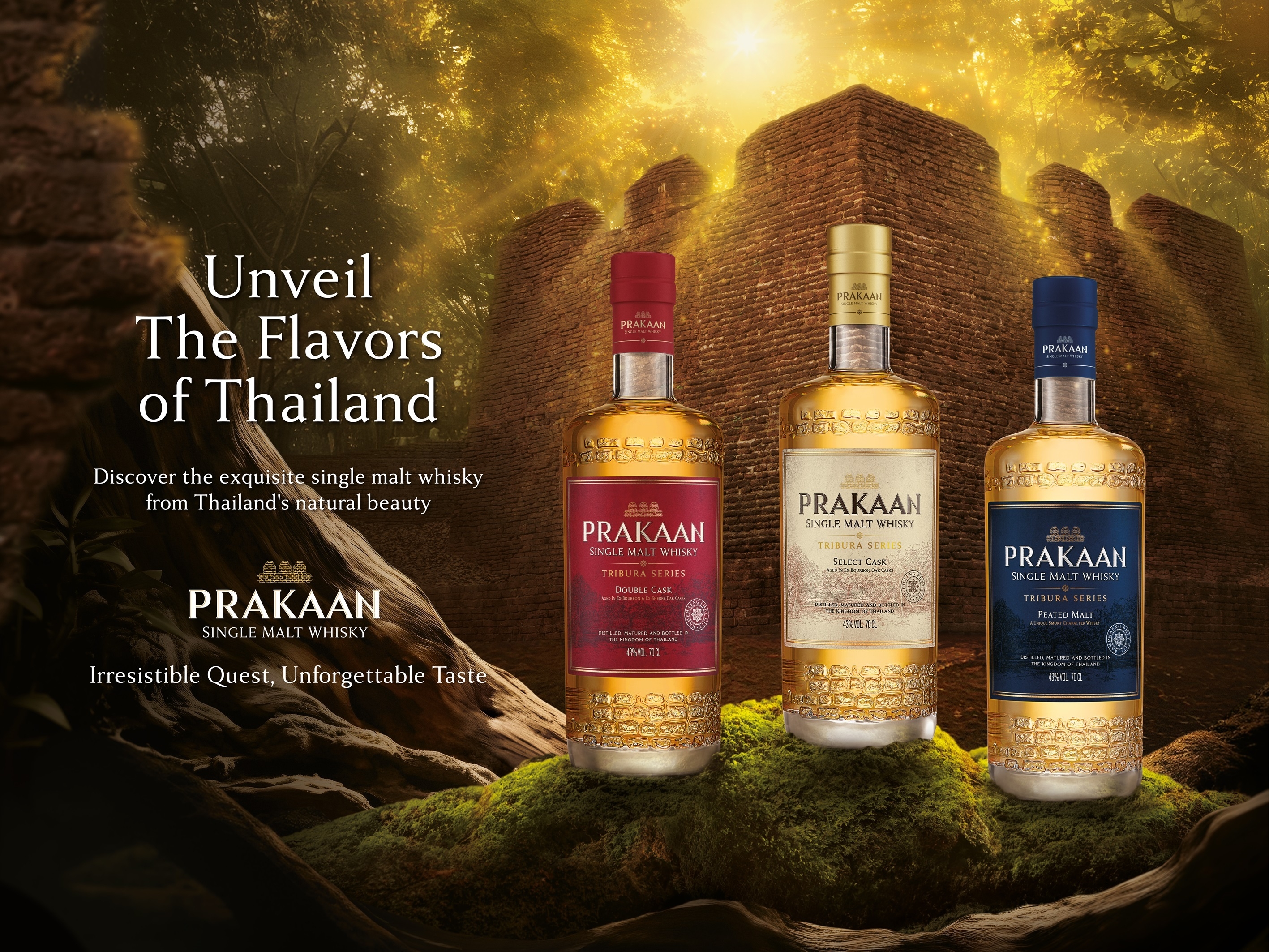 プラカーンシングルモルトウイスキーは、自然が豊かに残るタイ中北部の町、カムペーンペットで生まれました。この地では、澄んだ湧き水がゆっくりと地下貯水層にろ過され、上質なウイスキーづくりに理想的な環境を提供しています。カムペーンペットは、タイで最も古い都市の一つであり、繁栄した時代の重要な結節点として知られ、その印象的な城壁で名高い場所です。何世紀にもわたり、これらの城壁はタイ王国を守る堅固な防衛として立ち続けてきました。プラカーンシングルモルトウイスキーは、この誇り高き歴史の社会的・文化的意義を称え、この象徴的な都市とその由緒ある城壁に敬意を表し、その遺産を未来に繋ぎます。このウイスキーは、タイ王国で丹念に蒸留・熟成され、自然と何世紀にもわたるウイスキー製造の伝統と情熱を融合させた、誇り高き職人たちによって作られています。