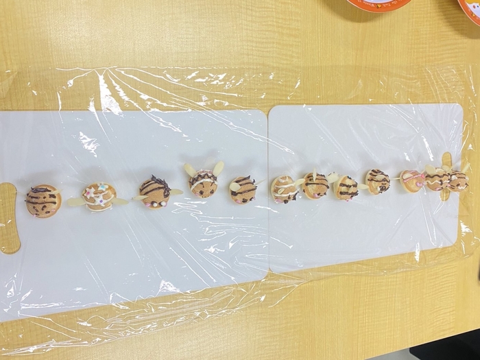 学生たちが特にこだわったのは、見た目にもインパクトのあるミツバチをモチーフにした鈴カステラをトッピングすること。どんな顔?どんな模様?など多くの意見を出し合い試作を重ねています。