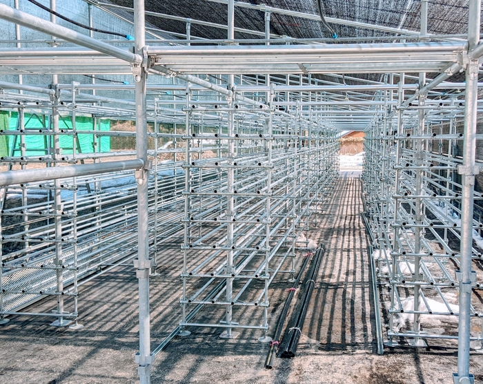 ハルカ社は2022年1月、本部農場内に営農型ソーラーハウスのモデル施設を着工。ソーラーパネルの重量負荷に耐えられるように、単管パイプを組み合わせて、キノコ菌床配置棚を施設構造と一体化させたモデルハウスを作りました。農水省の農研機構などの設計ガイドラインに沿った施工の上、実用新案の出願も行いました。ハルカ社では2022年春から、参入企業向けにモデルハウスなどを公開していきます。