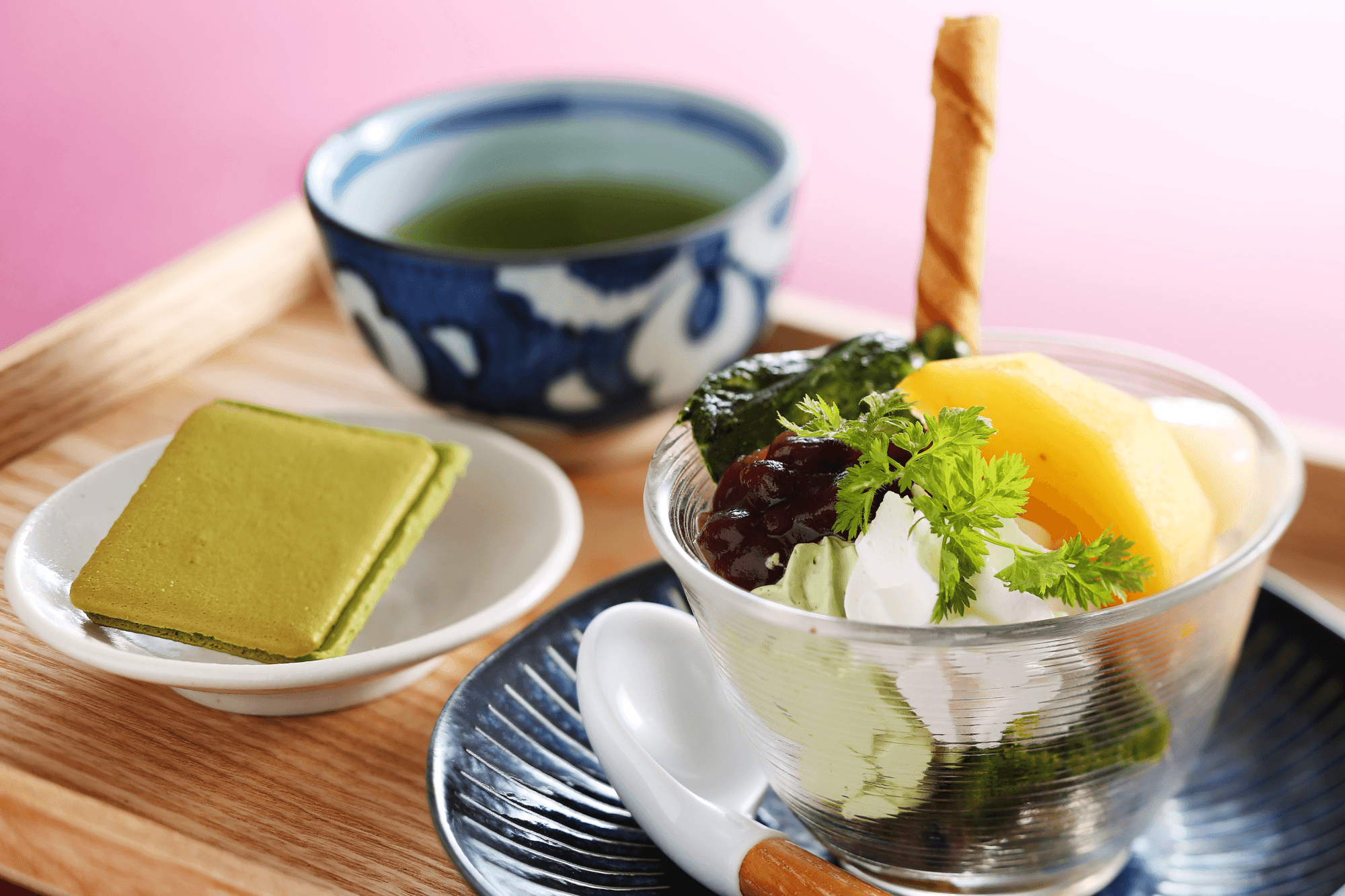 伊勢茶のロールケーキ、期間限定ミニ白玉パフェ(伊勢茶付き)を販売