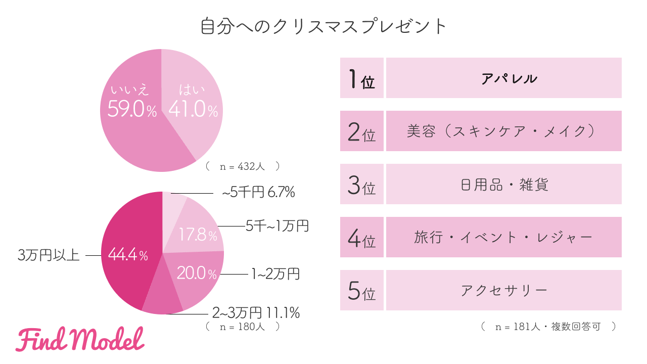 また自分へのクリスマスプレゼントとして購入を予定しているものでは、【アパレル】が1位という結果になりました。