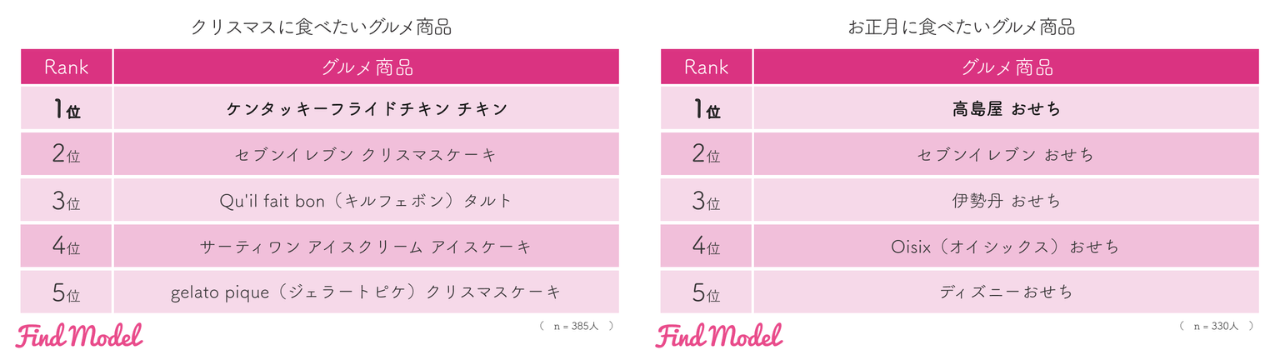 また、インフルエンサーがお正月に食べたいグルメ商品は【高島屋 おせち】が1位となりました。続けて【セブンイレブン おせち】【伊勢丹 おせち】【Oisix(オイシックス) おせち】が2、3、4位という結果になりました。