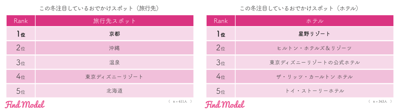 また、インフルエンサーがこの冬に注目しているホテル1位は【星野リゾート】という結果になりました。5位の【トイ・ストーリーホテル】は東京ディズニーリゾートの公式ホテルの中の1つなりますが、前回同様多くの票を集めランクインしました。