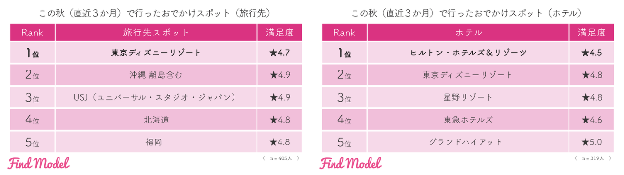 また、この秋インスタグラマーが行った宿泊施設1位は【ヒルトン・ホテルズ&リゾーツ】となりました。「細部に凝っていてとても気に入った!!(30代女性・4.3万フォロワー)」「駅近くで便利(40代女性・9.8万フォロワー)」等、前回のアンケートと同様に部屋の雰囲気や周りの施設へのアクセスなど過ごしやすいというコメントが多くありました。