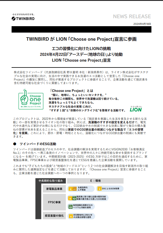 株式会社ツインバード様/プロジェクト賛同リリース
