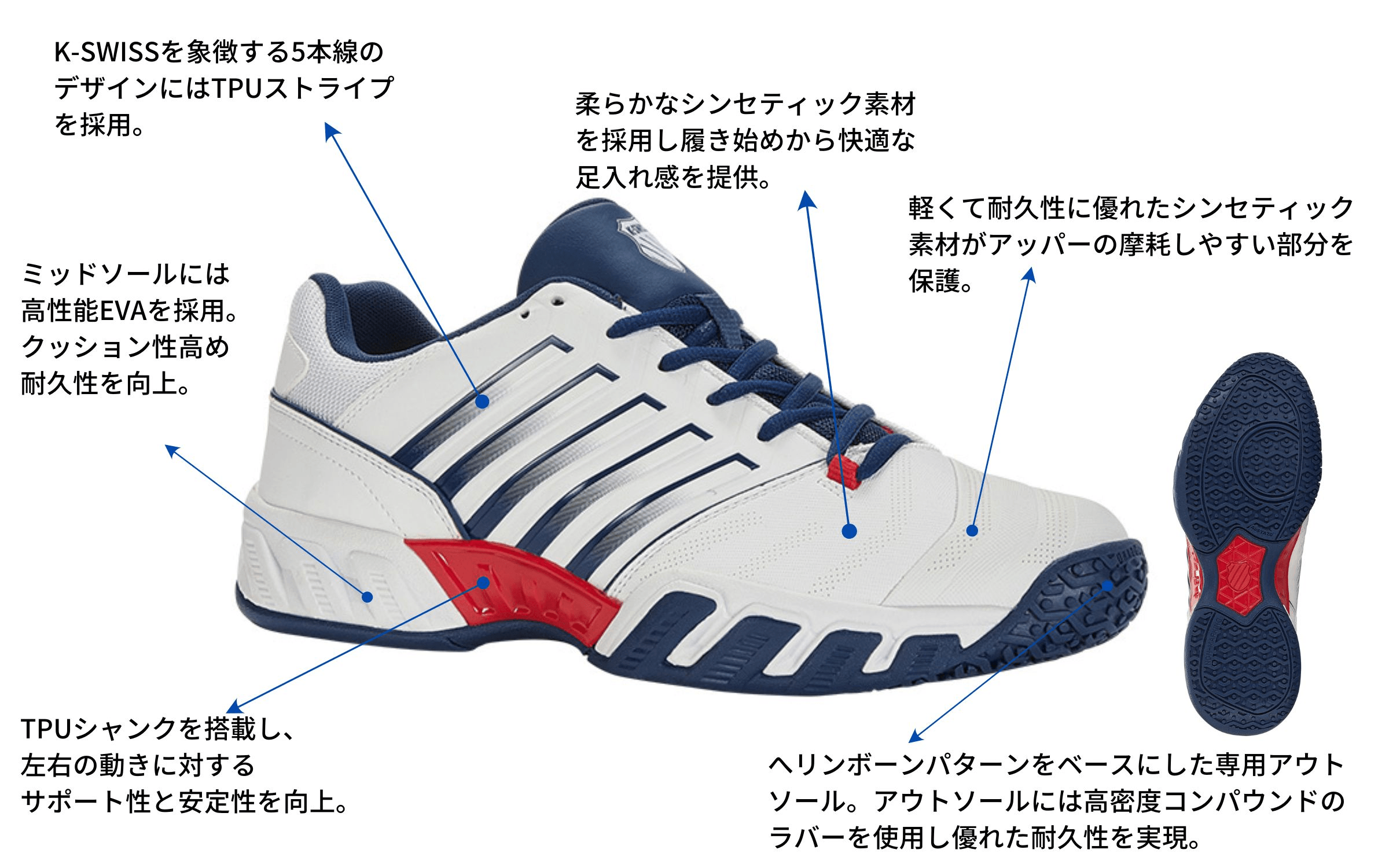 「K-SWISS」は1966年に世界で初めてオールレザーのテニスシューズを発売したカリフォルニア生まれのテニスシューズブランドです。現在ではATP、WTAツアー※で活躍するトッププレーヤーのフットワークをサポートしています。今回日本で販売するテニスシューズは、フィット感や快適性、サポート性を重視した軽量モデルで、初級者から上級者まで幅広い層のプレーヤーにご使用いただけます。