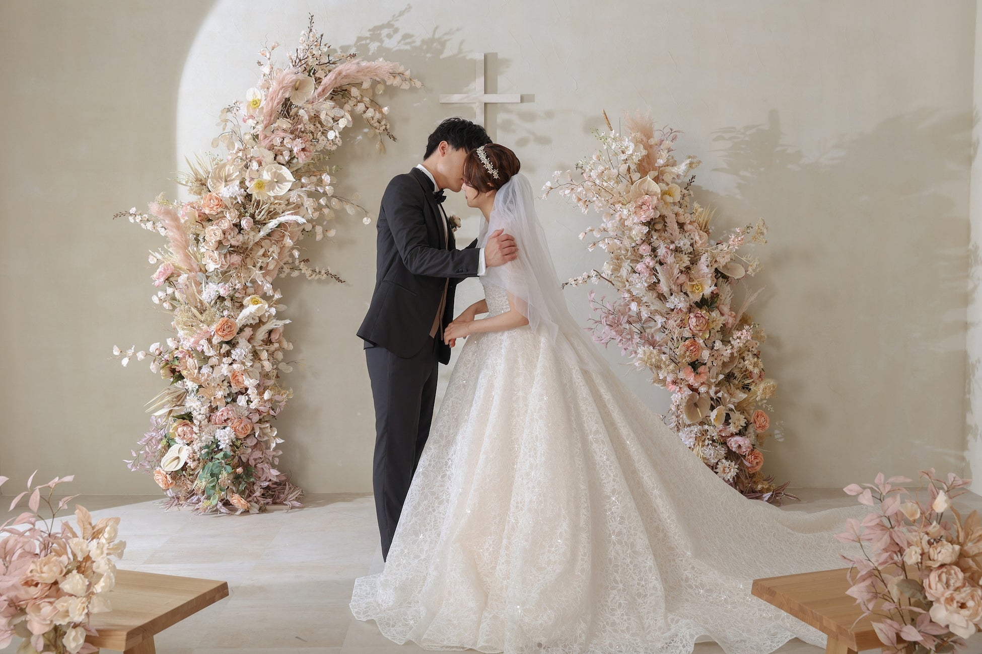 永遠の愛を誓うチャペル。ピンクベージュのフラワーアーチがおふたりの幸せを祝します。