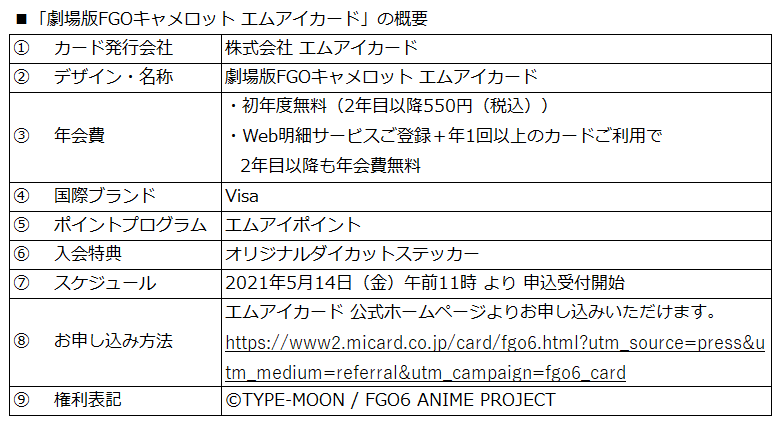 株式会社三越伊勢丹ホールディングス(本社:東京都新宿区、代表執行役社長 CEO:細谷 敏幸)の子会社である、株式会社 エムアイカード(本社:東京都中央区、代表取締役社長執行役員:梅田 貴生)は、株式会社アニプレックス(本社:東京都千代田区、代表取締役:岩上 敦宏)とクレジットカードの発行について提携し、『劇場版Fate/Grand Order-神聖円卓領域キャメロット-後編』の公開を記念して「劇場版FGOキャメロット エムアイカード」の申込受付を2021年5月14日(金)より開始いたします。