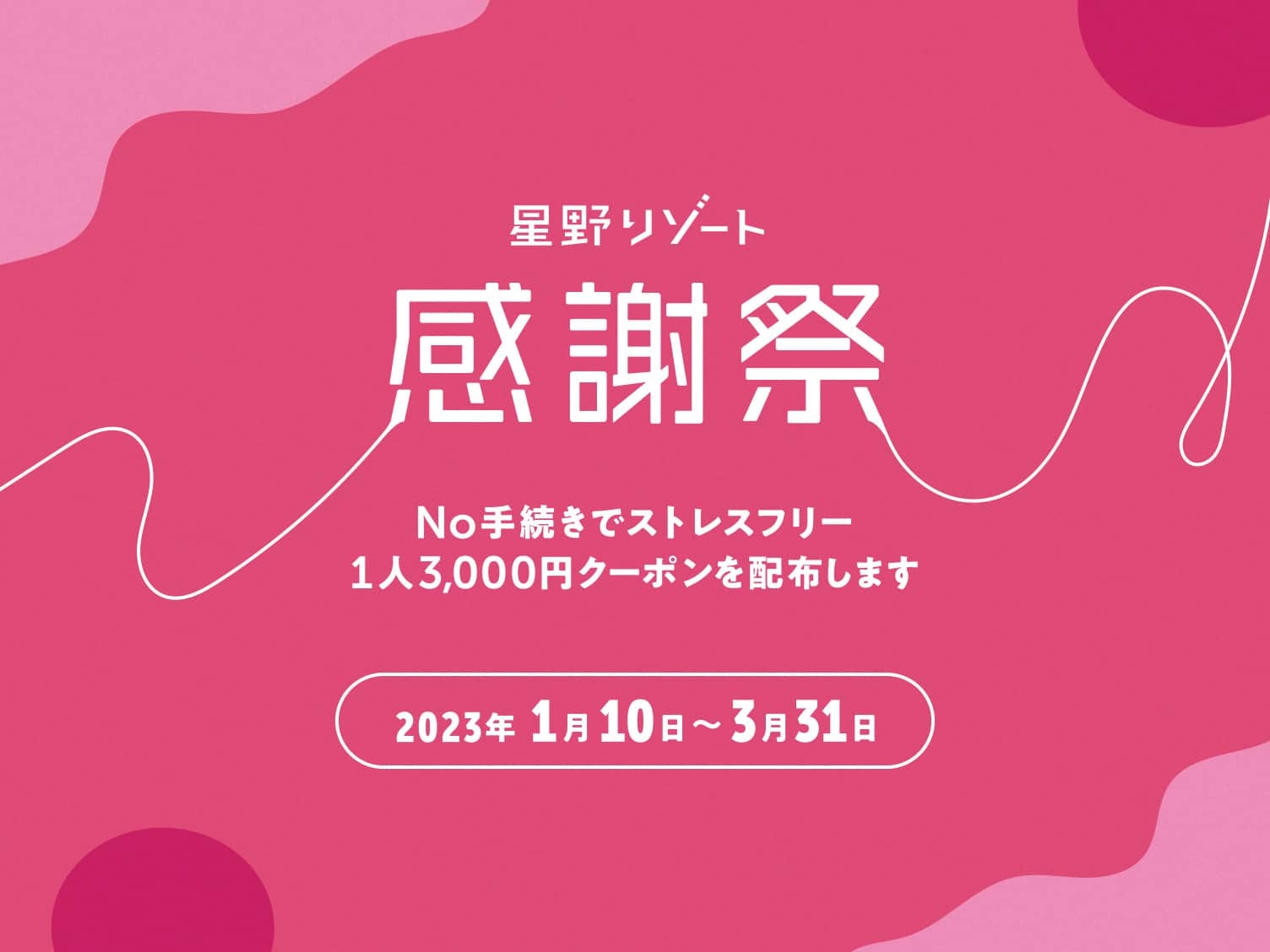 【星野リゾート】No手続きでストレスフリー!「星野リゾート 感謝祭」を開催 ~新規予約も予約済みのお客様も、滞在中に使用できる3,000円クーポンを配布~