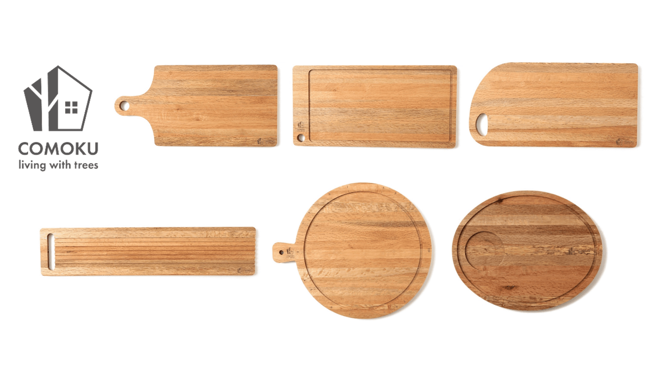 「木と共に心地よい暮らしを」というコンセプトで立ち上げたECブランド『COMOKU(コモク)』。木の価値を伝え、もっと多くの人に木のある心地よさを感じてほしい。木を正しく使うことで健やかな森を育み、人と自然が共存する心地よい社会に貢献したい。そんなブランドの思いを体現したこれらのカッティングボードは、「COMOKU」を象徴する商品として、製品のワンポイントにブランドロゴを刻印しています。