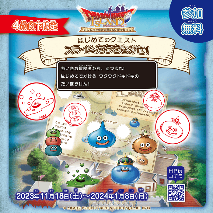 兵庫県立淡路島公園アニメパーク「ニジゲンノモリ」内にある大人気アトラクション「ドラゴンクエスト アイランド いにしえの魔神と導かれし冒険者たち」では、はじめてのクエスト「スライムたちをさがせ!」を2023年11月18日(土)から2024年1月8日(月・祝)の期間限定で開催いたします。