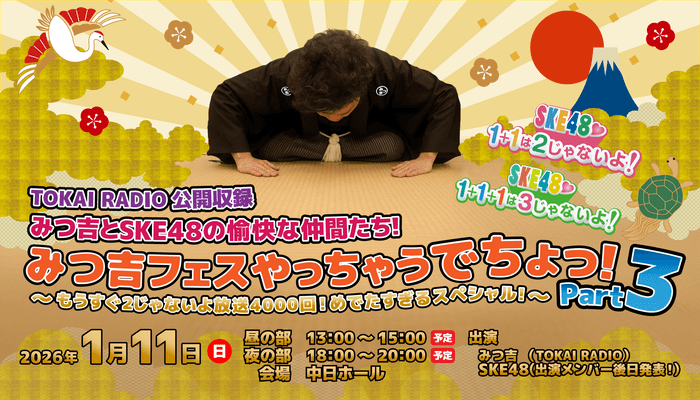 定員の4倍を超える応募が集まり、オリジナルグッズも販売開始から15分で完売するなど、過去の開催で大きな反響を呼んだ「みつ吉フェス」。その第3弾となる「TOKAI RADIO公開収録 みつ吉とSKE48の愉快な仲間たち!みつ吉フェスやっちゃうでちょっ!Part3~もうすぐ2じゃないよ放送4000回!めでたすぎるスペシャル!~」を実施することが決定した。