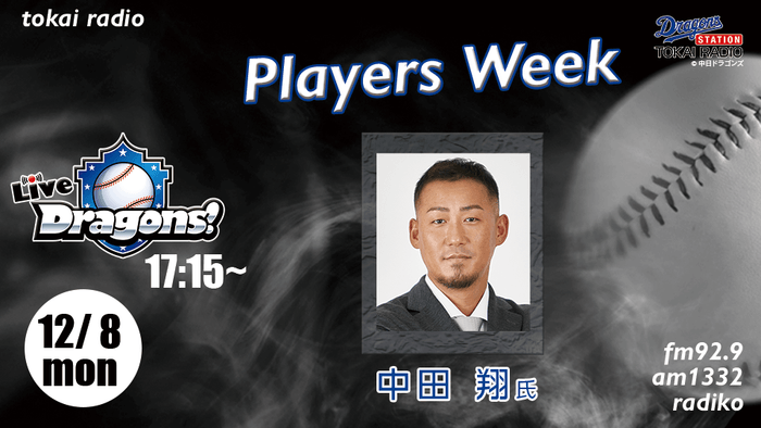 ドラゴンズ応援番組「Live Dragons!」(月曜日17時15分~18時00分/火曜日~金曜日17時15分~19時00分)は、12月8日(月)から12日(金)を「Players’ Week」と題し、中日ドラゴンズのキーマンが生出演する特別企画を送る。