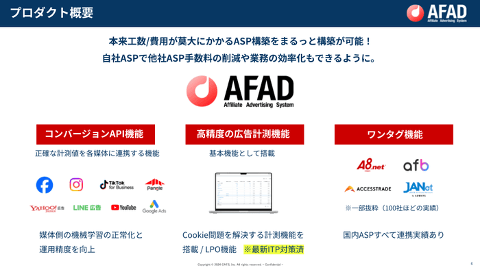 クリック数やCV数による従量課金がないため、自社ASPを構築したい事業者やASP事業をはじめたい代理店でも導入しやすく、シンプルかつ必要十分な機能で運用を実現します。