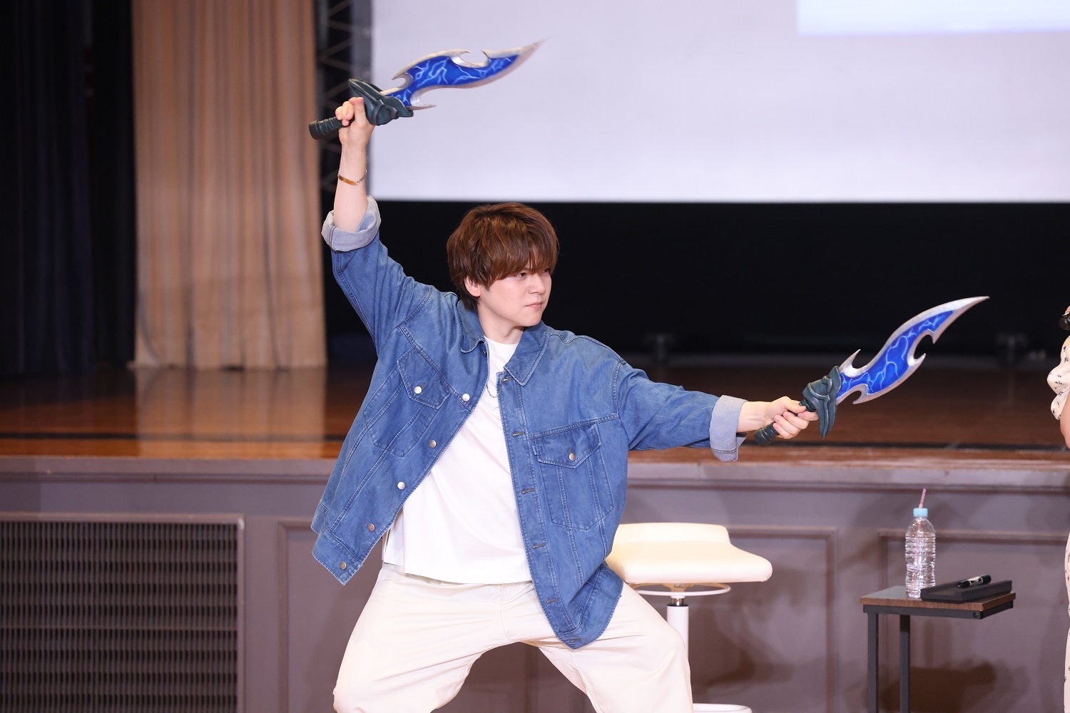 投票の集計が終わり、イベントは最後のコーナーであるユニークシナリオ「じゃんけん大会」のコーナーへ。「クソゲー〇番勝負!」にて各ゲームで勝利チームを予想していき、一番正答率が高かった人のみが参加を許されるこのゲーム。内田さんとのじゃんけんに勝利し続け残った最後の1人には内田さんが演じる主人公・サンラクの装備武器“湖沼の短剣”を元に「真化」させて作られた”傑剣への憧刃(デュクスラム)“のレプリカが贈られることが発表され、会場のボルテージは前回のイベント以上に高まりました。白熱した勝負が続き大盛り上がりで「じゃんけん大会」は幕を閉じました。