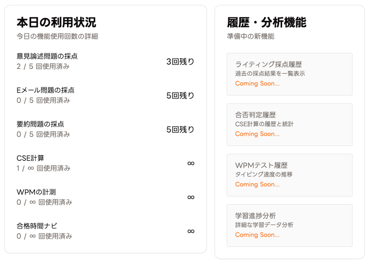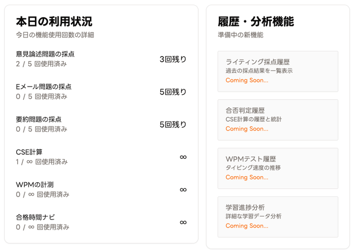- 答案・スコアをクラウド保存:ライティング添削結果や今後公開予定の「解答速報自己採点」結果をサーバー側で保持。