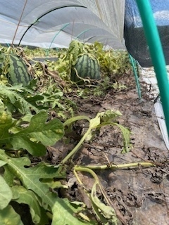 令和5年7月に発生した九州豪雨により収穫間近のスイカや生育途中のスイカのほとんどが廃棄処分となり、大きく被害を受けました。