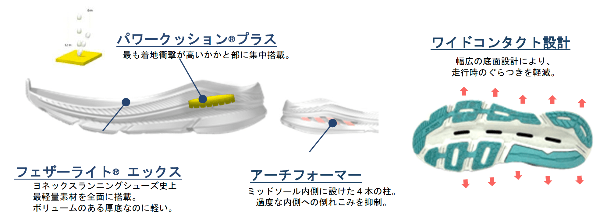 「CARBON CRUISE GLIDER」は、走行安定性の高いフラット形状の「3Dパワーカーボン」を搭載。さらに、軽量ながら衝撃吸収性、安定性の高い厚底クッションを採用し、ミッドソール内側に設けた4本の柱(アーチフォーマー)の周囲には、ヨネックスランニングシューズ史上最軽量素材であるフェザーバウンスフォームを搭載。内側への倒れ込みをさらに抑制し、長距離走行をより快適にサポートします。また、底面には優れた耐摩耗性を持つエンデュランスラバーを使用しています。