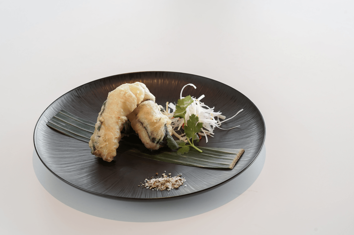 利島産の高級珍味「ウツボ」をフリットで仕上げました。