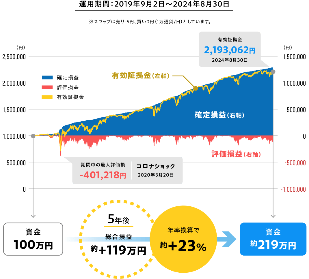 特設ページには、『トラリピ戦略リスト』で提案している「NOK/SEK Half&Half戦略」を2019年9月~2024年8月の5年間で運用した場合のバックテスト結果を掲載しております。