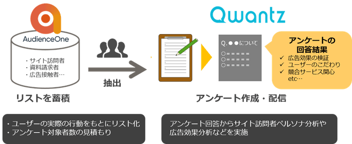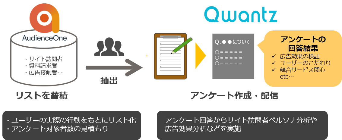 連携により、企業は「Qwantz」が用意するデモグラフィックデータやライフスタイルデータに加えて、「AudienceOne®」を活用し、さらに細かなアンケート対象者の抽出が可能となります。具体的には、サイト来訪者に対して来訪背景の分析、買い物かごページでの離脱理由の検証、オンライン広告接触者を抽出してブランドリフト効果の検証などを非常に低価格で行うことが可能となります。