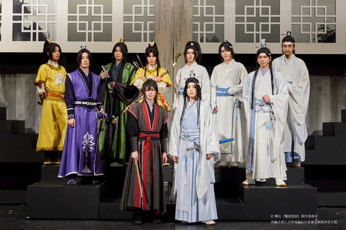左から 金子軒 役:武子直輝、江澄 役:和田琢磨、聶懐桑 役:安井一真、金凌 役:田村升吾、魏無羨 役:金子隼也、藍忘機 役:廣瀬智紀、藍思追 役:安藤夢叶、藍景儀 役:土屋直武、藍曦臣 役:小松準弥、藍啓仁 役:村田 充
