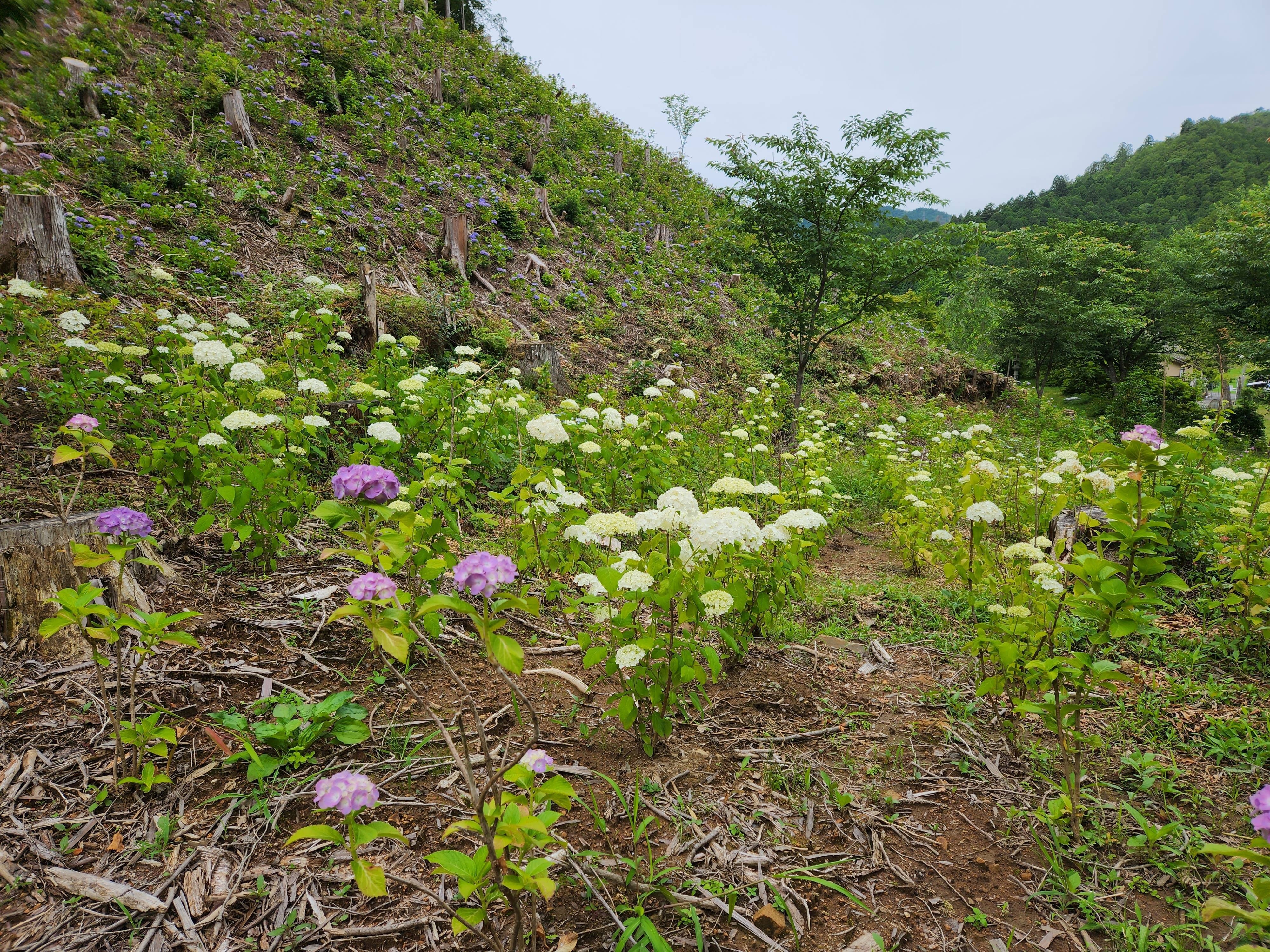 京都洛北の真言宗御室派宝泉寺「花宝苑」では、2022年秋、10,500株のあじさいの植栽を完了し、2023年初夏には、6,000株のあじさいに花をつけました。2024年の初夏には1万株のあじさいが咲き誇ることと期待しています。下記にて、公開を予定しておりますが十分な開花がなかった場合の中止の可能性があります。2024年6月1日以降、当苑ホームページにて、開花状況をご報告する予定です。