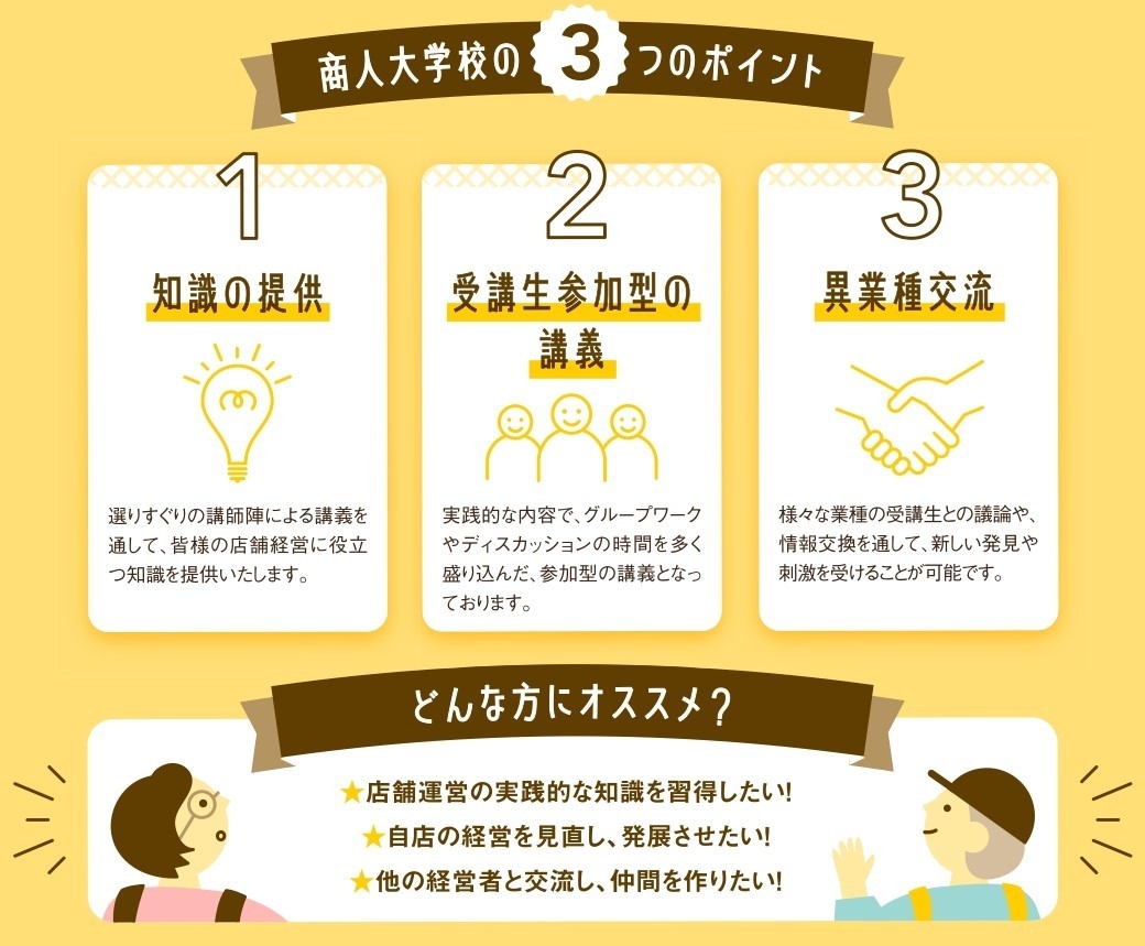 東京都及び公益財団法人東京都中小企業振興公社では、経営意欲あふれる飲食店、小売店、サービス業の経営者、後継者、従業員、開業予定者の方を対象に「商人大学校・入門講座」を開講いたします。集合講座4回+オンライン講座4テーマにて、お店の経営に役立つ知識を提供いたします。3年ぶりの実施となる集合講座は、秋葉原駅より徒歩約5分の「AP秋葉原」が会場となります。グループディスカッション等を盛り込んだ参加型の講義で、様々な業種の受講生との交流の場としてもご活用いただけます。