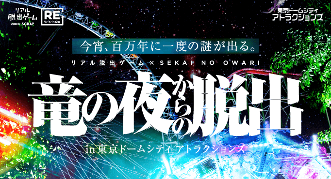 株式会社SCRAP(本社:東京都渋谷区 代表:加藤隆生)は、2023年11月23日(木祝)より期間限定で、SEKAI NO OWARIとコラボレーションしたリアル脱出ゲーム『竜の夜からの脱出』リバイバル公演を、東京ドームシティ アトラクションズにて開催することを発表いたします。