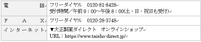 大正製薬ダイレクト オンラインショップ:https://www.taisho-direct.jp/