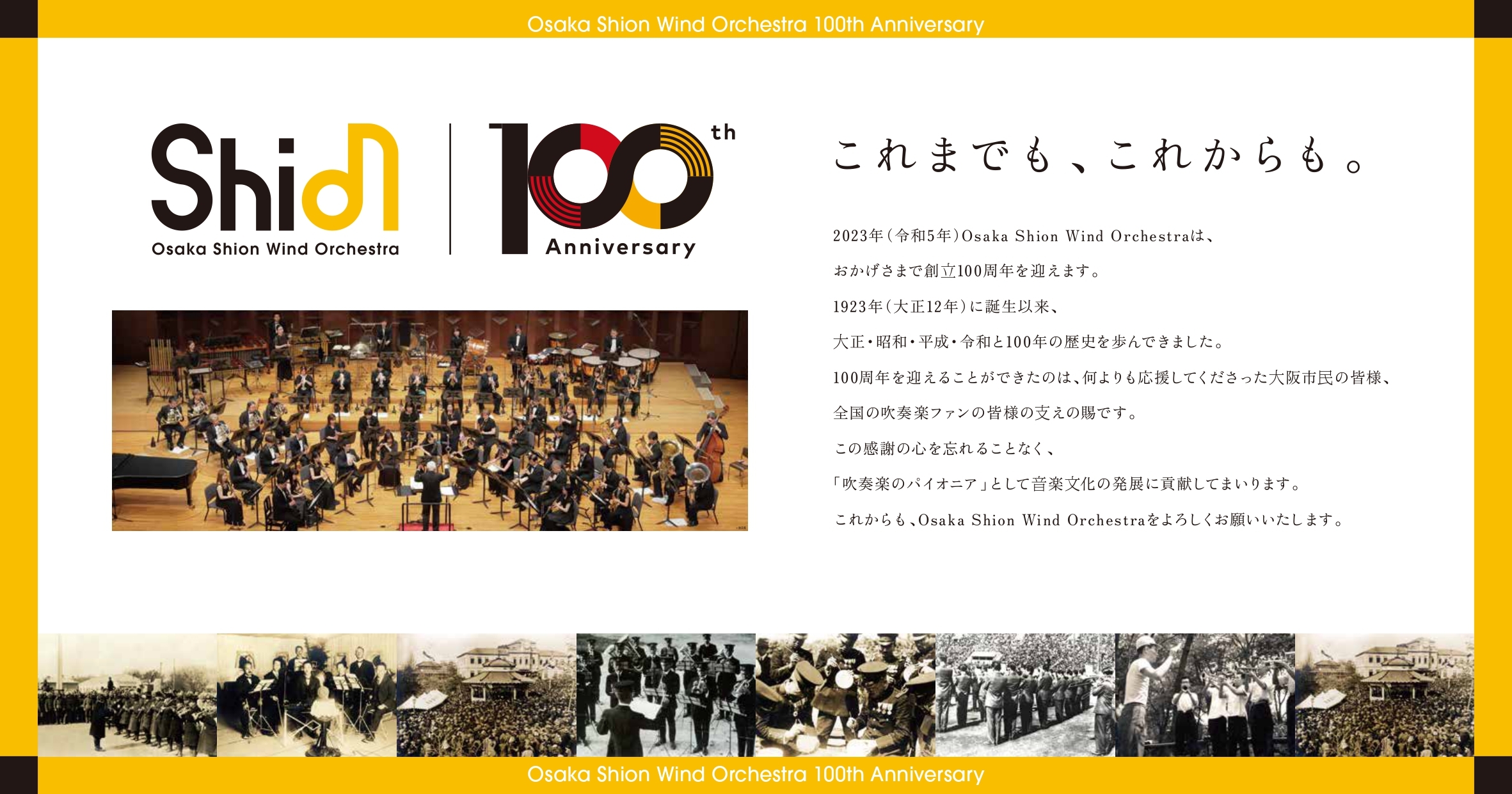 旧陸軍第4師団軍楽隊の有志を中心に、1923年に結成された「大阪市音楽隊」から「大阪市音楽団」そして「Osaka Shion Wind Orchestra」と改称し、2023年に創立100周年を迎えました。