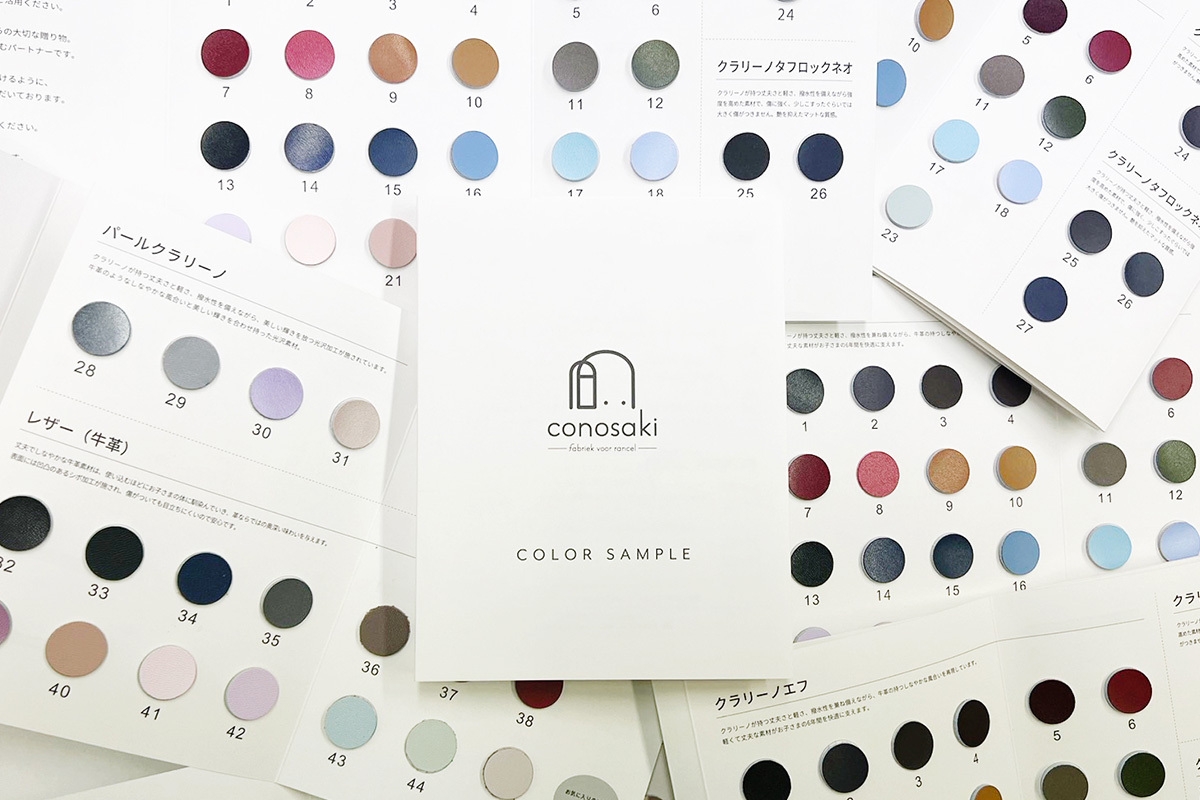 conosakiで展開しているランドセルのカラーチップが全て入っている特別仕様の冊子となっています。実際のランドセルに使用している素材をお付けしていますので、お手元で「見て・触れて」色味と素材ごとの質感をご確認いただけます。