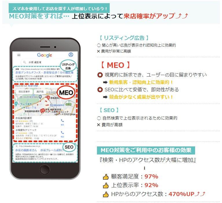 MEOとは、Map Engine Optimization(マップ検索エンジン最適化)の略で、Google検索におけるマップ領域(=Googleマップ)で上位表示させるための施策のことです。
