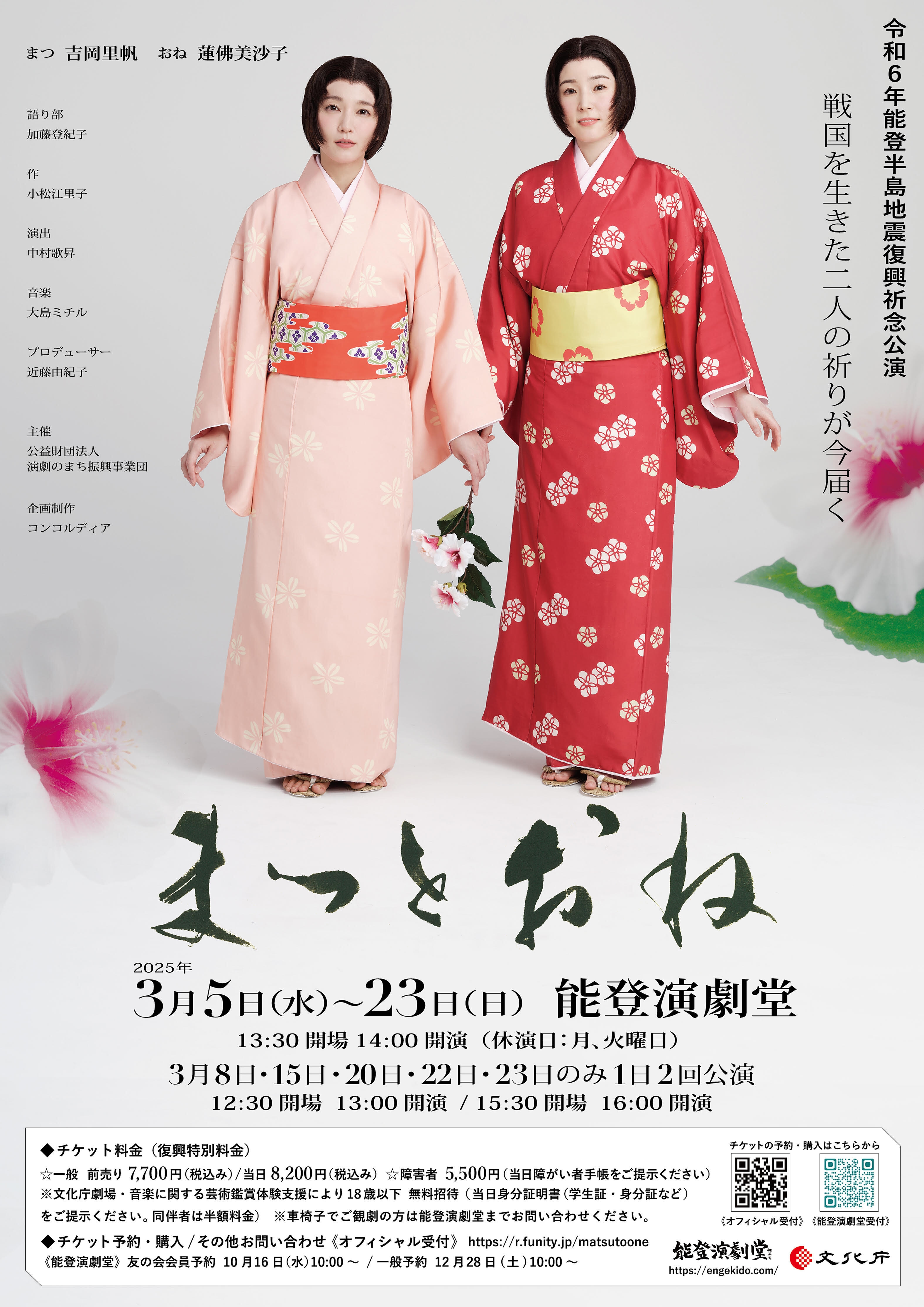 2025年3月5日(水)~23日(日)、石川県七尾市・能登演劇堂(運営:公益財団法人演劇のまち振興事業団)にて、令和6年能登半島地震復興祈念公演「まつとおね」が合計20ステージ上演されます。本公演では初共演の吉岡里帆さん、蓮佛美沙子さんがダブル主演を務め、脚本はNHK大河ドラマ「天地人」などで知られた作家 小松江里子氏、企画・キャスティング・プロデュースを手掛けるのは七尾市出身の近藤由紀子氏です。