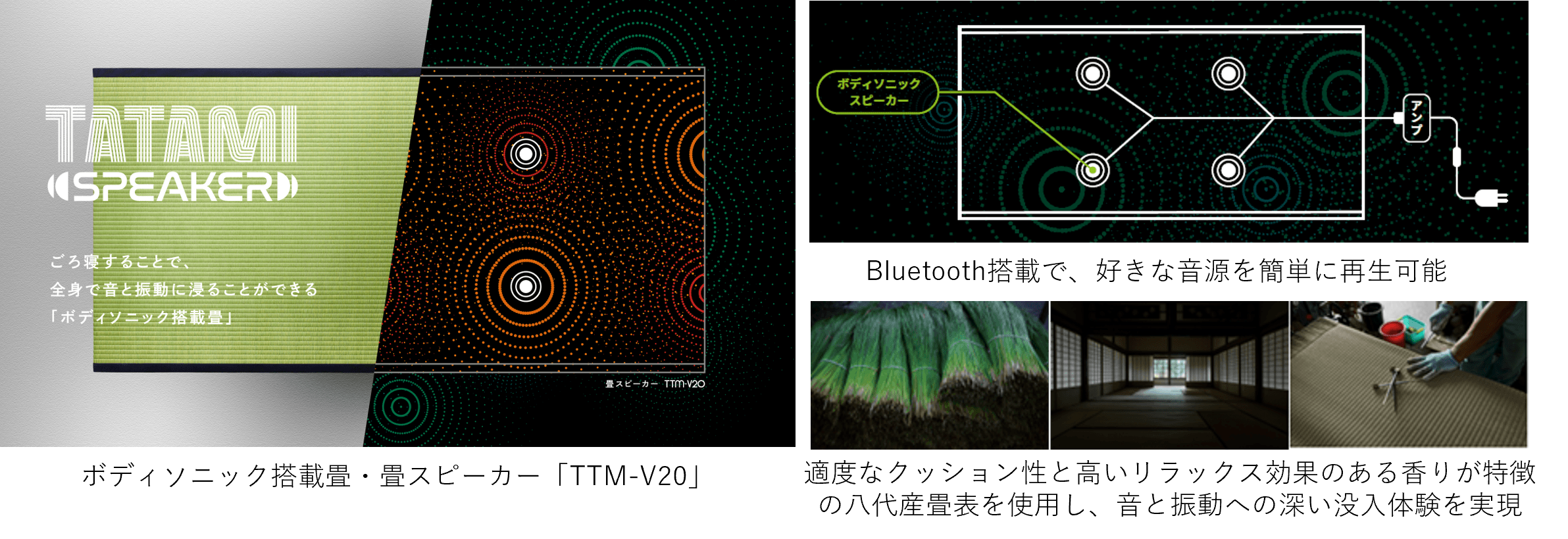 『畳スピーカー「TTM-V20」』は振動スピーカーを畳の内部に4基搭載し、畳に「ごろ寝」をすることで、全身で音と振動に浸ることができる“ボディソニック搭載畳”です。畳と接触した身体の部位から音の振動を感じることができ、その目的に合った音源を作ることで、休憩所等でのリラックスシーンから、迫力ある音楽や映像作品の鑑賞まで、さまざまな用途での活用が可能なプロダクトです。