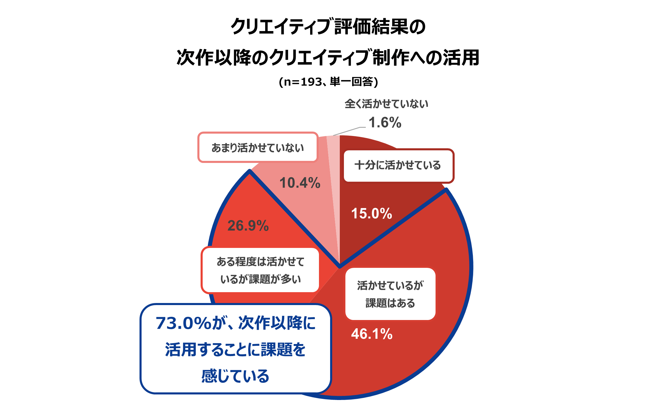●およそ9割の企業が評価結果をクリエイティブ改善に活用していると回答した一方、十分に活用できていると回答した企業はおよそ3割にとどまり、およそ6割の企業が評価結果のクリエイティブ改善への活用に課題を抱えていました。
