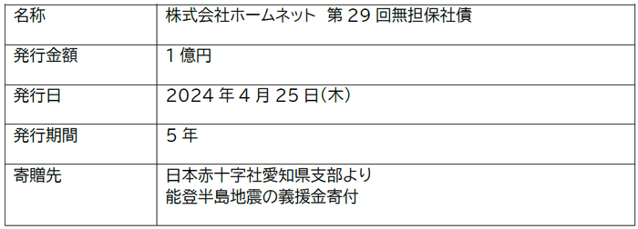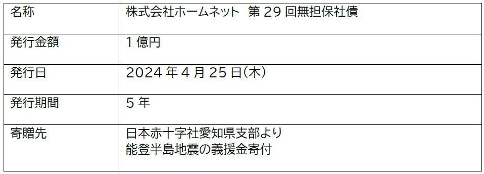 テクノロジーで気軽な住み替えをサポートする株式会社property technologies(以下「当社」)のグループ会社である株式会社ホームネット(以下「ホームネット」)は、被災者の皆さまの救助及び被災地の復旧に少しでもお力になれますよう、株式会社愛知銀行(以下「愛知銀行」)を引受先とする、あいぎんSDGs私募債「あすなろ」を発行し、発行手数料の一部を能登半島地震の義援金として寄付をいたしました。