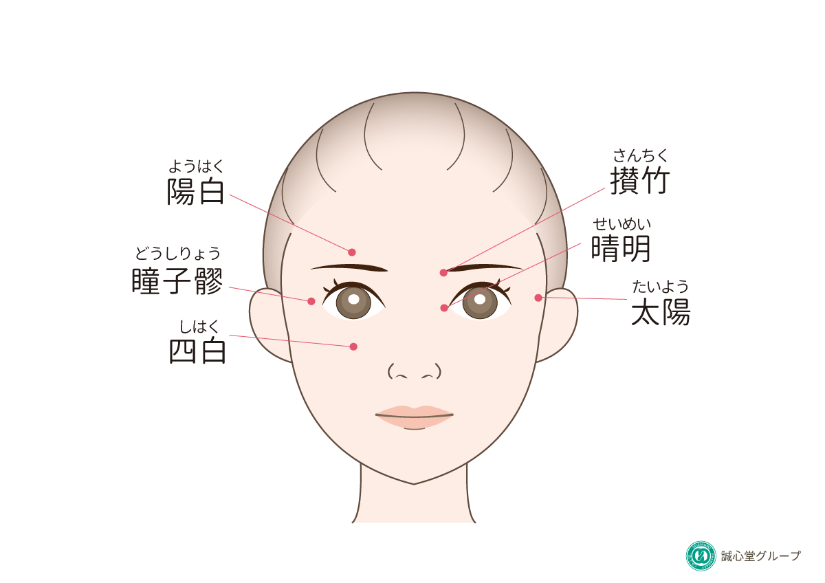 睛明(せいめい)、太陽(たいよう)、攅竹(さんちく)、陽白(ようはく)、瞳子リョウ(どうしりょう)、四白(しはく)
