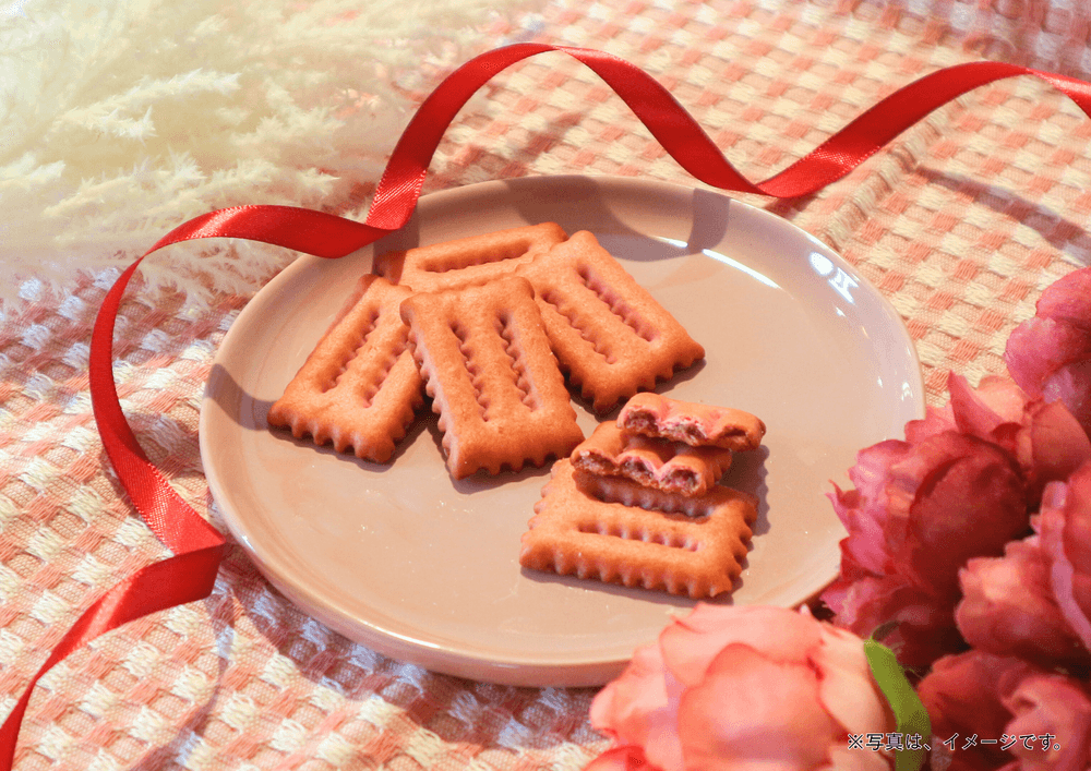 しるこサンドのやわらかな甘みに苺の甘酸っぱさを加えた、ビスケット生地とあんこの調和が楽しめる一品です。