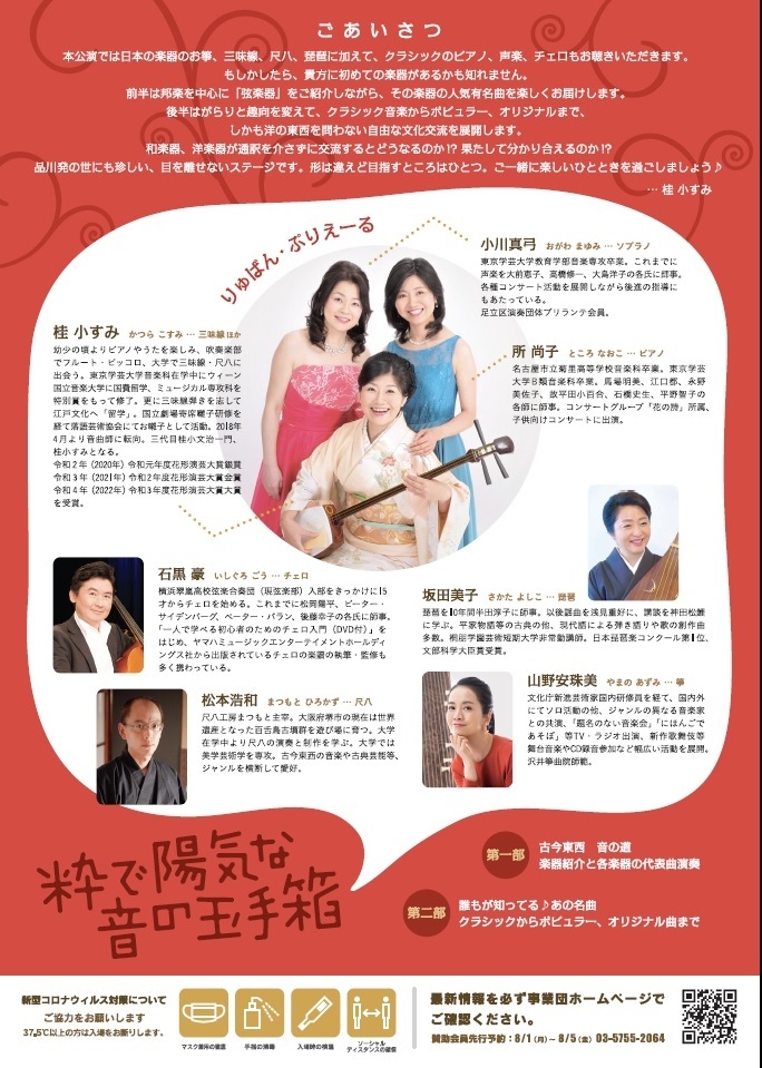 公益財団法人品川文化振興事業団(東京都品川区西大井1-4-25、以下 事業団)は、音楽会「粋で陽気な音の玉手箱 ~和と洋で奏でるポピュラー名曲~」を10月9日(日)スクエア荏原 ひらつかホール(東京都品川区荏原4-5-28)にて開催いたします。
